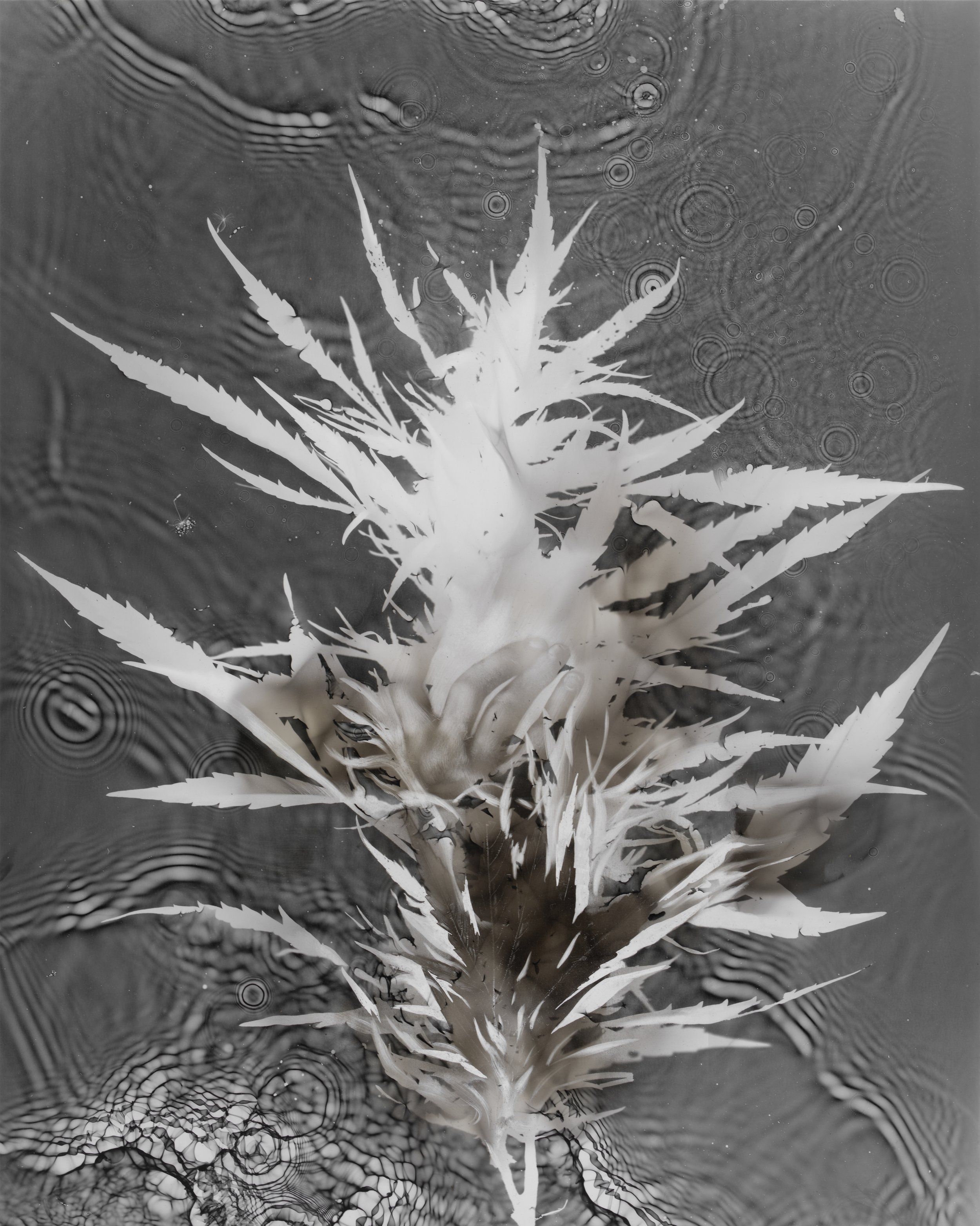 A photogram is a camera-less contact printing technique which consists of capturing silhouettes left by the direct intervention, or shadow cast by an object that is placed upon on a photosensitive medium. A rudimentary technique at the very root of photography, namely the ‘writing of light’. It is a long and tedious process, which requires working in prepared darkrooms, and welcoming chaos as a creative partner. The beautifully unpremeditated part is compounded when the photosensitive paper is submerged under water, the waves, droplets and any other ripples are frozen by the flash of light.